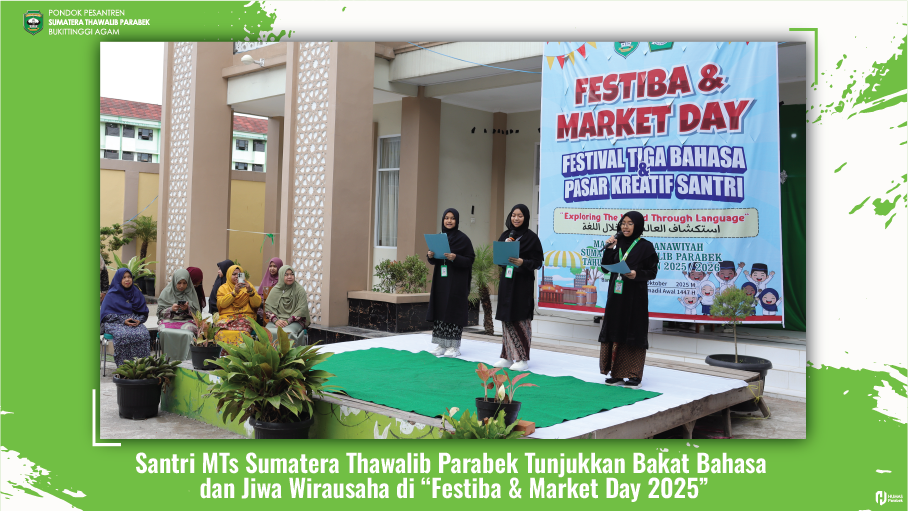 Parabek, Agam — Madrasah Tsanawiyah Sumatera Thawalib Parabek kembali menghadirkan suasana semarak dengan pelaksanaan Festival Tiga Bahasa (Festiba) dan Market Day 2025, sebagai bentuk pengaplikasian program P5RA (Proyek Penguatan Profil Pelajar Pancasila dan Rahmatan lil ‘Alamin).Kegiatan ini digelar pada Sabtu, 25 Oktober 2025, secara serentak di Kampus 1 Parabek untuk santriwan dan Kampus 3 Bangkaweh untuk santriwati.